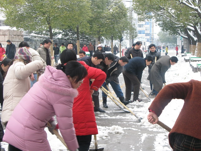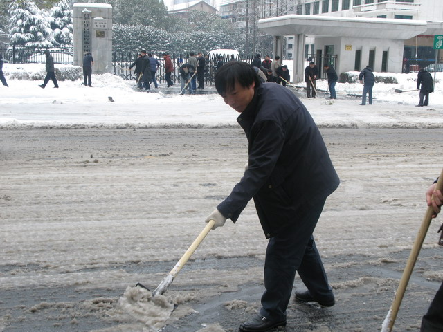 公司全体员工掉臂天寒地冻,,,,,,热火朝天的在陌头挥锹铲雪,,,,,,迅速扫除了公司院内、门前及荣事达大道市府广场至寿春路段交通主干道的路面积雪,,,,,,包管了公司收支车辆及门前交通干道的行车清静,,,,,,受到市民的赞许。。。